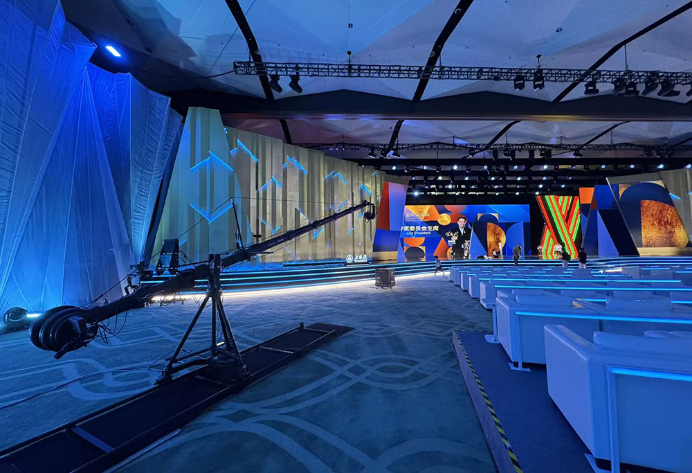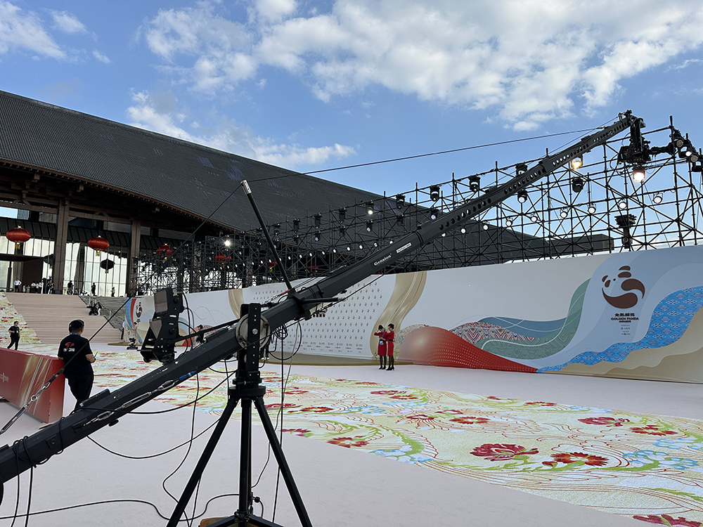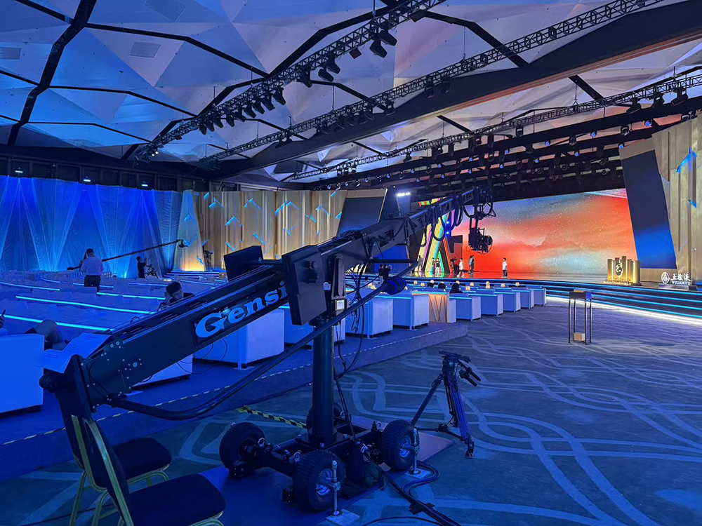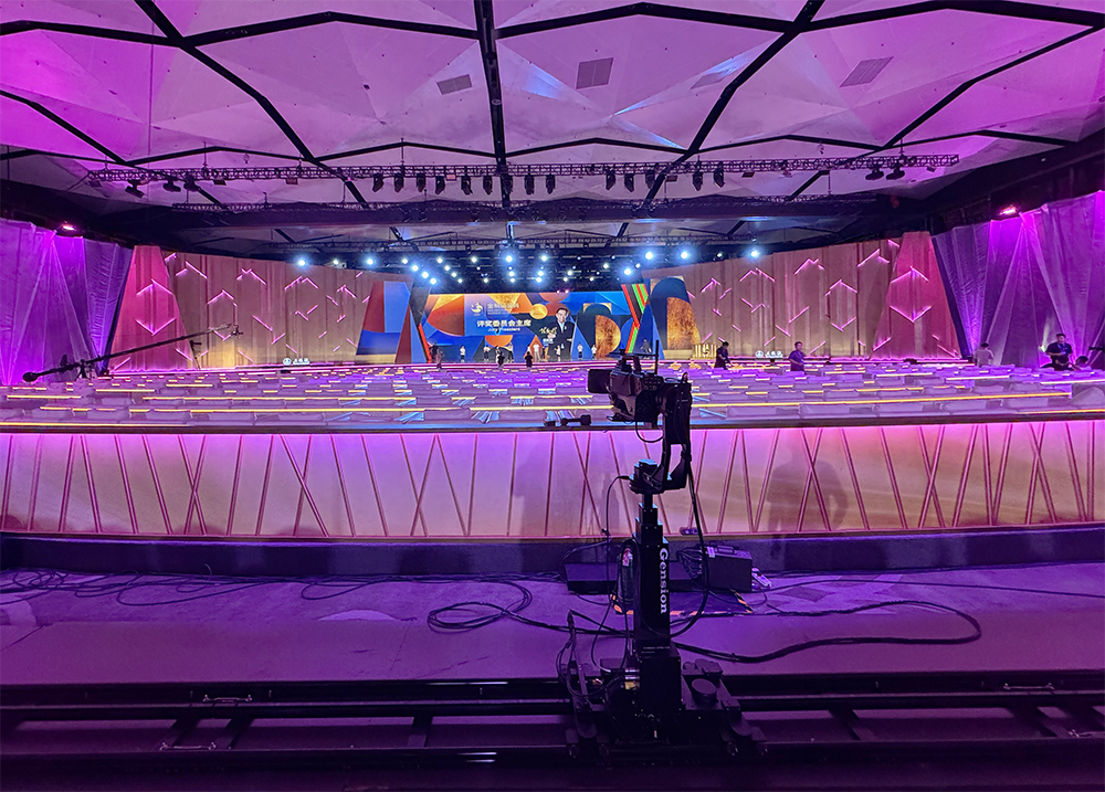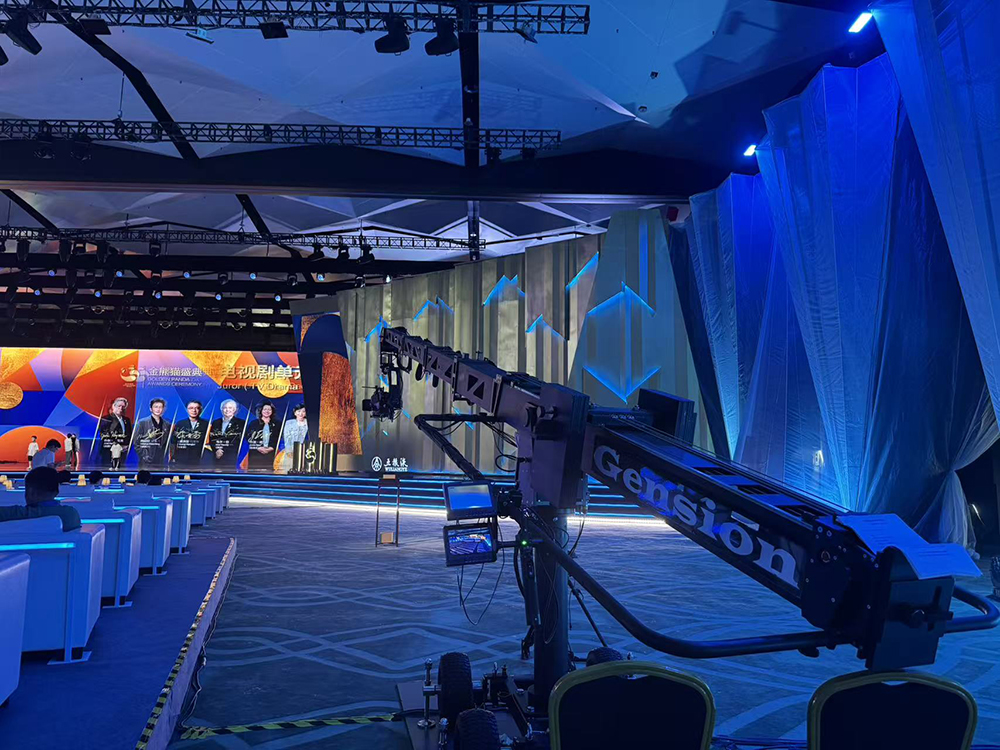 堪称大景拍摄的王牌设备,其超长伸缩范围可完整覆盖整个舞台及延伸区域。既能清晰呈现主舞台与嘉宾席融合的恢弘全景,传递典礼的盛大氛围;在节目高潮等关键节点,更能通过微调角度实现全景与细节的无缝切换,兼顾场面气势与情绪表达。